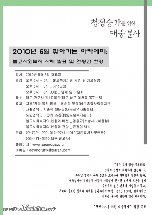 ‘ûÁ¤½Â°¡¸¦ À§ÇÑ ´ëÁß°á»ç(ÀÇÀå Áø¿À, ÀÌÇÏ ’´ëÁß°á»ç‘)’´Â ‘5¿ù ´ëÁß°á»ç ã¾Æ°¡´Â ¾ÆÄ«µ¥¹Ì’¸¦´Â ºÒ±³»çȸº¹Áö ºÐ¾ß¿¡¼ ÀǹÌÀÖ´Â ¼º°ú¸¦ º¸À̰í ÀÖ´Â ´ë±¸ °ü¿À»çÀÇ Æ÷±³ °æÇè¿¡ ´ëÇÑ »ç·Ê ¹ßÇ¥¿Í ÇÔ²² ¿ÜºÎÀü¹®°¡ÀÇ ¹ßÁ¦¸¦ ÅëÇØ ºÒ±³»çȸº¹ÁöÀÇ ÀÇ¹Ì¿Í Àü¸ÁÀ» ÇÔ²² ¸ð»öÇÏ´Â ÀÚ¸®·Î ¿¬´Ù. 5¿ù 3ÀÏ ¿¸± À̹ø ¾ÆÄ«µ¥¹Ì´Â ´ë±¸ °ü¿À»ç¿¡¼ ¿î¿µ ¶Ç´Â ÈÄ¿øÇÏ´Â º¹Áö½Ã¼³À» ޹æÇϰí, ޹æ ÈÄ¿¡´Â ½Ç¹«ÀÚµé°ú Àü¹®°¡µéÀÇ ¹ßÁ¦¿Í Àüü Âü¿©ÀÚ°¡ ÇÔ²²ÇÏ´Â Á´ãȸ¸¦ °¡Áú °èȹÀÌ´Ù.