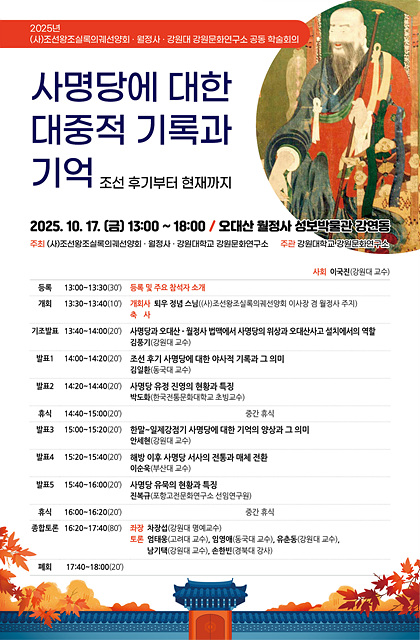 10¿ù 17ÀÏ(±Ý) ¿ÀÈÄ 1½ÃºÎÅÍ 6½Ã±îÁö´Â ¿ùÁ¤»ç ¼ºº¸¹Ú¹°°ü °Àǵ¿¿¡¼ <»ç¸í´ç¿¡ ´ëÇÑ ´ëÁßÀû ±â·Ï°ú ±â¾ï>À» ´ëÁÖÁ¦·Î Çмú¼¼¹Ì³ª¸¦ °³ÃÖÇÑ´Ù. ¼¼¹Ì³ª´Â (»ç)Á¶¼±¿ÕÁ¶½Ç·ÏÀDZ˼±¾çȸ ÀÌ»çÀå °â ¿ùÁ¤»ç ÁÖÁö Åð¿ì Á¤³ä ½º´ÔÀÇ °³È¸»ç¸¦ ½ÃÀÛÀ¸·Î ¡ã<»ç¸í´ç°ú ¿À´ë»ê-¿ùÁ¤»ç ¹ý¸Æ¿¡¼ »ç¸í´çÀÇ À§»ó°ú ¿À´ë»ê»ç°í ¼³Ä¡¿¡¼ÀÇ ¿ªÇÒ> ±èdz±â °¿ø´ë ±³¼ö ¡ã<Á¶¼± Èı⠻ç¸í´ç¿¡ ´ëÇÑ ¾ß»çÀû ±â·Ï°ú ±× ÀǹÌ> ±èÀÏȯ µ¿±¹´ë ±³¼ö ¡ã<»ç¸í´ç À¯Á¤ Áø¿µÀÇ ÇöȲ°ú Ư¡> ¹ÚµµÈ Çѱ¹ÀüÅ빮ȴëÇб³ Ãʺù±³¼ö ¡ã¾È¼¼Çö °¿ø´ë ±³¼ö <ÇѸ»~ÀÏÁ¦ °Á¡±â »ç¸í´ç¿¡ ´ëÇÑ ±â¾ïÀÇ ¾ç»ó°ú ±× ÀǹÌ> ¡ãÀ̼ø¿í ºÎ»ê´ë ±³¼ö <ÇØ¹æ ÀÌÈÄ »ç¸í´ç ¼»çÀÇ ÀüÅë°ú ¸Åü Àüȯ> ¡ãÁøº¹±Ô Æ÷Ç×°íÀü¹®È¿¬±¸¼Ò ¼±ÀÓ¿¬±¸¿ø <»ç¸í´ç À¯¹¬ÀÇ ÇöȲ°ú Ư¡> ¹ßÇ¥°¡ À̾îÁø´Ù.