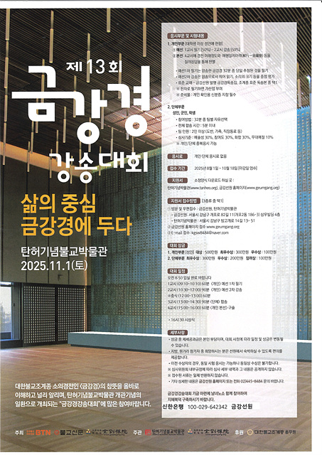 ±Ý°¼±¿øÀº ´ëÇѺұ³Á¶°èÁ¾ÀÇ ¼ÒÀǰæÀüÀÎ ±Ý°°æÀÇ Âü¶æÀ» ¿Ã¹Ù·Î ÀÌÇØÇÏ°í ³Î¸® ¾Ë¸®¸ç, źÇã±â³äºÒ±³¹Ú¹°°ü °³°ü±â³äÀÇ ÀÏȯÀ¸·Î ºÒ±â 2569(2025)³â 11¿ù 1ÀÏ(Åä)¿ÀÀü 8½Ã 30ºÐºÎÅÍ ¡®Á¦13ȸ ±Ý°°æ°¼Û´ëȸ¡¯¸¦ °³ÃÖÇÑ´Ù.
