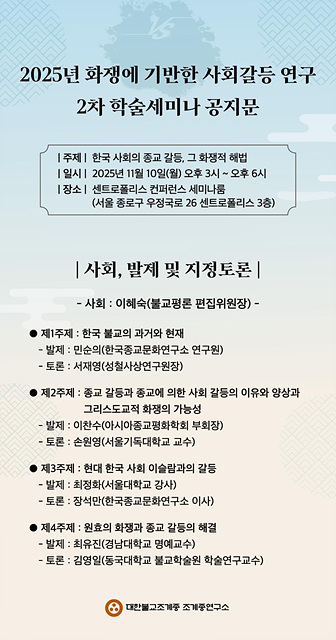 ´ëÇѺұ³Á¶°èÁ¾ Á¶°èÁ¾¿¬±¸¼Ò(¼ÒÀå ¿øÃ¶ ½º´Ô)´Â ºÒ±â 2569(2025)³â 11¿ù 10ÀÏ(¿ù) ¿ÀÈÄ 3½ÃºÎÅÍ 6½Ã±îÁö °øÆòµ¿ ¼¾Æ®·ÎÆú¸®½º ÄÁÆÛ·±½º(°øÆòµµ½ÃÀ¯ÀûÀü½Ã°ü 3Ãþ)¿¡¼ ⟪Çѱ¹ »çȸÀÇ Á¾±³°¥µî, ±× ÈÀïÀû ÇØ¹ý⟫À» ÁÖÁ¦·Î Çмú¼¼¹Ì³ª¸¦ °³ÃÖÇÑ´Ù.