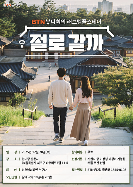 BTN º×´Ùȸ°¡ ÃÊ´ëÇÏ´Â ·¯ºêÅÛÇýºÅ×ÀÌ ¡°Àý·Î°¥±î¡±´Â ¹ÌÈ¥ ³²³à ´©±¸³ª Áö¿øÀÌ °¡´ÉÇϸç Âü°¡ºñ´Â ¹«·áÀÌ´Ù. ÀÚ¼¼ÇÑ ¹®ÀÇ´Â BTN º×´Ùȸ Äݼ¾ÅÍ ÀüÈ 1855-0108·Î »ó´ã ¹× ½ÅûÀÌ °¡´ÉÇÏ´Ù.