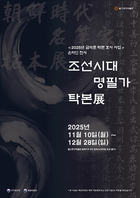 ´ëÇѺұ³Á¶°èÁ¾ ºÒ±³Áß¾Ó¹Ú¹°°ü(°üÀå ¼ºÀ ½º´Ô)Àº ¡®2025³â ±Ý¼®¹® Źº» Á¶»ç »ç¾÷¡¯ÀÇ ÀÏȯÀ¸·Î ¿Â¶óÀÎ Àü½Ã ¡¶Á¶¼±½Ã´ë ¸íÇʰ¡ Źº»î÷¡·(ÀÌÇÏ Àü½Ã)À» ºÒ±³Áß¾Ó¹Ú¹°°ü ȨÆäÀÌÁö(http://museum.buddhism.or.kr) ¶Ç´Â ¸µÅ©(https://buddhism-museum.web.app)Á¢¼ÓÀ» ÅëÇØ 2025³â 11¿ù 10ÀÏ(¿ù)ºÎÅÍ 2025³â 12¿ù 28ÀÏ(ÀÏ)±îÁö °³ÃÖÇÑ´Ù. À̹ø Àü½Ã´Â ¿ì¼öÇÑ Ç°ÁúÀÇ Å¹º»À» ÅëÇØ Á¶¼±½Ã´ë ´ëÇ¥ ¼¿¹°¡µéÀÌ ³²±ä ÇʹýÀ» °¨»óÇÒ ¼ö ÀÖ´Â ÀÚ¸®·Î, ¼®ºÀ ÇÑÈ£à´Üç ùÛûÍ(1543-1605), Á׳² ¿ÀÁØñÓÑõ çïñâ(1587-1666), Ãß»ç ±èÁ¤ÈñõÕÞÈ ÑÑïáýì(1786-1856)µî 13ÀÎÀÇ ¸íÇʰ¡°¡ ¾´ ºñ¹®ÝøÙþÀ» °ø°³ÇÑ´Ù.