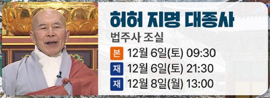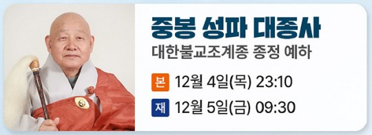 ÁߺÀ ¼ºÆÄ ´ëÁ¾»çÀÇ ¹ý¾î´Â °áÁ¦ÀÏÀÎ 12¿ù 4ÀÏ(¸ñ) ¹ã 11½Ã 10ºÐ¿¡, ÇØÀÎÃѸ² ÇØÀÎ»ç ¹æÀå ÇÐ»ê ´ë¿ø ´ëÁ¾»çÀÇ ¹ý¾î´Â 12¿ù 5ÀÏ(±Ý) ¿ÀÈÄ 1½Ã¿¡ ¹æ¼ÛÇÑ´Ù. Á¶°èÃѸ² ¼Û±¤»ç ¹æÀå Æí¾ç Çö¹¬ ´ëÁ¾»ç´Â 12¿ù 5ÀÏ(±Ý) ¿ÀÈÄ 1½Ã 30ºÐ¿¡, ¹ýÁÖ»ç Á¶½Ç ÇãÇã Áö¸í ´ëÁ¾»ç´Â 12¿ù 6ÀÏ(Åä) ¿ÀÀü 9½Ã 30ºÐ¿¡ ¹æ¼ÛÇÑ´Ù.