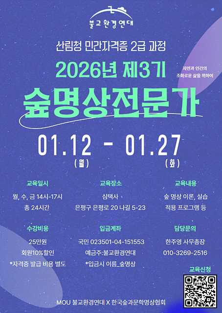 ºÒ±³È¯°æ¿¬´ë(»óÀÓ´ëÇ¥ ¹ý¸¸)´Â ºÒ±³°è¸¦ ´ëÇ¥Çϴ ȯ°æ´ÜüÀÌÀÚ ½£Çؼ³°¡ Àü¹®±³À°±â°üÀ¸·Î½á ÀÚ¿¬ÀÇ ¾Æ¸§´Ù¿ò°ú Á¶È¸¦ ¹è¿ì°í, »ý¸íÀÇ Á¸¾ö¼º°ú °¡Ä¡¸¦ ÀνÄÇÏ°Ô µÇ¸ç, ÀÚ¿¬ ¼Ó¿¡¼ »ç¶÷ÀÇ ¸¶À½À» µ¹º¸°í ÀÚ¿¬°ú ±íÀÌ ±³°¨ÇÏ´Â ½£Çؼ³°¡¸¦ ¾ç¼ºÇϰí ÀÖÀ¸¸ç, 2026³â 1¿ù 16ÀÏ(±Ý)ºÎÅÍ 1¿ù 27ÀÏ(È)±îÁö ¼¿ï ½ÉÅû翡¼ ¡®Á¦3ȸ ½£¸í»óÀü¹®°¡ ±³À° 2±Þ °úÁ¤¡¯À» °³ÃÖÇÑ´Ù.