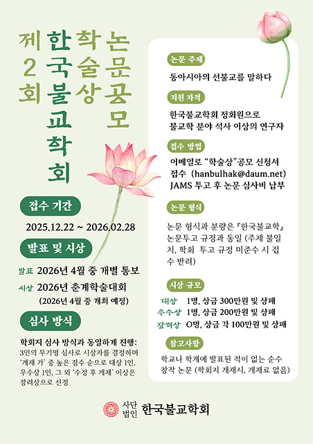 ¡ã¡¯Á¦2ȸ Çѱ¹ºÒ±³ÇÐȸ Çмú»ó¡®Àº »óÇϹݱâ·Î ³ª´©¾î °ø¸ð ÁÖÁ¦¸¦ ¼³Á¤Çϰí ÀÌ¿¡ ºÎÇÕÇÏ´Â ³í¹®À» Á¢¼ö½É»çÇÏ´Â Çмú»óÀ¸·Î, 2026³â »ó¹Ý±â °ø¸ð ÁÖÁ¦´Â <µ¿¾Æ½Ã¾ÆÀÇ ¼±ºÒ±³¸¦ ¸»ÇÏ´Ù>ÀÌ´Ù.