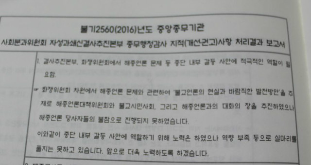 Á¶°èÁ¾ Áß¾ÓÁ¾¹«±â°ü ÇàÁ¤°¨»ç¿¡¼ ÀÚ¼º°ú¼â½Å°á»çÃßÁøº»ºÎ°¡ ¡®ÈÀïÀ§ Â÷¿ø¿¡¼ ÇØÁ¾¾ð·Ð°ú °ü·ÃÇÑ ´ëÈÀÇ ÀåÀ» ÃßÁøÇßÀ¸³ª, ÇØÁ¾¾ð·Ð ´ç»çÀÚµéÀÇ ºÒÂüÀ¸·Î ÁøÇàµÇÁö ¸øÇß´Ù¡¯°í º¸°íÇÑ °¡¿îµ¥ ÀÌ´Â »ç½ÇÀÌ ¾Æ´Ñ °ÍÀ¸·Î ¹àÇôÁ³´Ù.