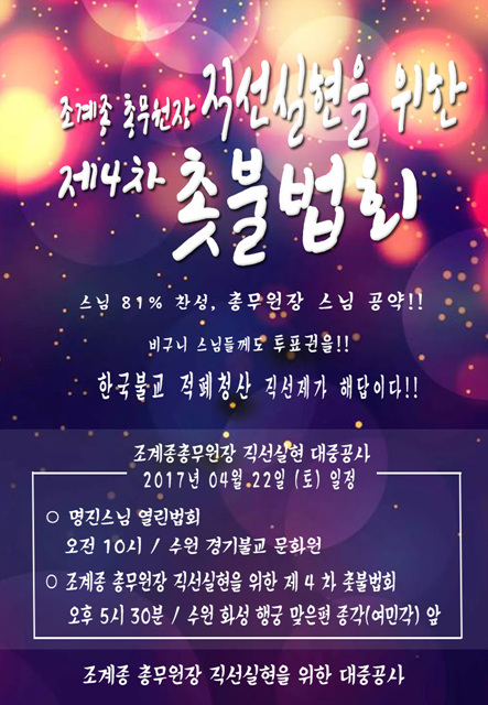 Ãѹ«¿øÀå Á÷¼± ½ÇÇöÀ» À§ÇÑ ´ëÁß°ø»ç(ÀÌÇÏ ´ëÁß°ø»ç)´Â 4¿ù 22ÀÏ ¿ÀÈÄ 5½Ã30ºÐ ¼ö¿ø ȼº Çà±Ã ¸ÂÀºÆí ¿©¹Î°¢ ¾Õ¿¡¼ Á¶°èÁ¾ Ãѹ«¿øÀå Á÷¼± ½ÇÇöÀ» À§ÇÑ Á¦4Â÷ Ãкҹýȸ¸¦ °³ÃÖÇÑ´Ù°í ¹àÇû´Ù. ´ëÁß°ø»ç°¡ Á÷¼±Á¦ ½ÇÇöÀ» À§ÇØ °³ÃÖÇÑ Ãкҹýȸ´Â À̹øÀÌ ³× ¹øÂ°´Ù.
