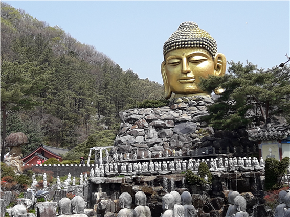 Â÷¸¦ ÁÖÂ÷½ÃŰ°í ¸î ¹ß ¶çÀÚ¸¶ÀÚ Å« ºÒµÎ(ÝÖÔé)¸¦ º¸°Ô µË´Ï´Ù. ´ÙµëÁö ¾ÊÀº ¸·µ¹·Î ºÒ´ÜÀÌ Á¶¼ºµÇ¾ú°í, ±× À§¿¡ ºÎó´ÔÀÇ ¸Ó¸®¸¦ ¸ð¼Ì´Âµ¥ ³ôÀ̰¡ ¹«·Á 8m³ª µË´Ï´Ù. Àý ¸¶´ç¿¡ µé¾î¼¸é¼ Âü¹èÇÏ°Ô µÇ´Â °Å´ëÇÑ È²±Ýºû ºÒµÎ»óÀº ¿Í¿ìÁ¤»ç¸¦ ³ªÅ¸³»´Â ù ¹øÂ° »ó¡¹°ÀÔ´Ï´Ù. ºÎó´Ô²²¼ ³»·Á´Ùº¸½Ã´Â ¾Æ·¡ÂÊ¿¡´Â ³ÐÀº ¿¬¸øÀÌ Àִµ¥, ºÎó´Ô²²¼ ½Ã¹æ¼¼°è¿¡ Å« ÀÚºñ½ÉÀ» º£Çª½Ã´Â ««ÀÌ º¸½Ãµµ·Ï ÆÈ¶Ò¸¸ÇÑ À×¾îµéÀÌ Çì¾öÄ¡°í ÀÖ½À´Ï´Ù.