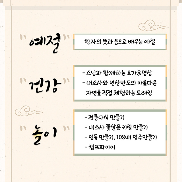 ¡®[3¹Ú4ÀÏ]³»¼Ò»ç Çѹ®Çд硯ÀÇ ÁÖ¿äÀÏÁ¤Àº ÇÑÀÚ°ÀÇ 1°~7°, ¿ä°¡&¸í»ó, 108¹è ¿°ÁÖ ¸¸µé±â, Á÷¼ÒÆøÆ÷ Æ®·¹Å·, Ä·ÇÁÆÄÀ̾î, ¿¬µî¸¸µé±â, ۸µ¸¸µé±â µîÀÌ ÁøÇàµÉ ¿¹Á¤ÀÌ´Ù.