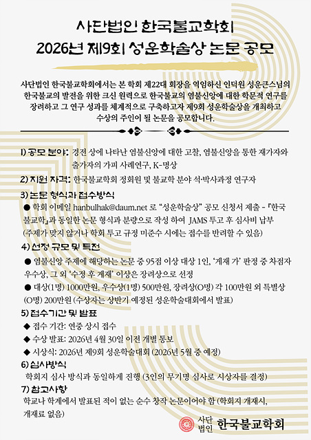 »ç´Ü¹ýÀÎ Çѱ¹ºÒ±³ÇÐȸ(ȸÀå ¿°Áß¼· ÀÚÇö ½º´Ô)´Â ºÒ±³ÇÐ ¿¬±¸ÀÇ ÁøÈï°ú Çй®Àû ¼º°úÀÇ È®»êÀ» À§ÇÏ¿©, 2026³â »ó¹Ý±â¿¡ ½ÃÇàµÇ´Â µÎ °³ÀÇ Çмú»ó ³í¹® °ø¸ð¸¦ ½Ç½ÃÇÑ´Ù.