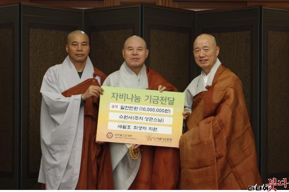 Á¶°èÁ¾ ¼ö¿ø»ç(ÁÖÁö ¼º°ü ½º´Ô)°¡ Àç´Ü¹ýÀÎ ¾Æ¸§´Ù¿îµ¿Çà(ÀÌ»çÀå Àڽ ½º´Ô)¿¡ ¼¼¿ùÈ£ Èñ»ýÀÚµéÀ» À§ÇÑ ÇÇÇØÁö¿ø ¼º±Ý 1õ¸¸ ¿øÀ» Àü´ÞÇß´Ù.