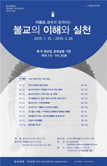 ºÒ±â2653(2019)³â 1¿ù 15ÀÏ(È) Àú³á 7½Ã ¼¿ïÀåÃæµ¿ ¿ì¸®ÇÔ²² ºôµù 2Ãþ ¹®È»ì·Õ ±â·é¿¡¼ ºÒ±³°³ÇõÇൿ ´ã¸¶¹ßÀü¼Ò ¡®Âü¾ÆÄ«µ¥¹Ì¡¯ ù °Á·Π¡®ÀÌÁßÇ¥ Àü³²´ë öÇаú ±³¼ö¿Í ÇÔ²²ÇÏ´Â ºÒ±³ÀÇ ÀÌÇØ¿Í ½Çõ¡¯À» °³°ÇÑ´Ù. ÀÌÁßÇ¥ ±³¼ö´Â ÃʱâºÒ±³ Àü¹®°¡ÀÌ¸é¼ ´ë½ÂºÒ±³ °æÀüÀ» ¼³¸³ÇØ ´Ù¾çÇÑ °ÀÇ·Î º×´ÙÀÇ °¡¸£Ä§À» ÀüÇϰí ÀÖ´Ù.