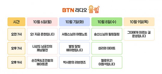 10¿ù7ÀÏ ¿ÀÀü 7½Ã¿¡´Â ºÒÀÚ ¿¬¿¹Àεé·Î ±¸¼ºµÈ 'Á¶°èÁ¾ ¿¬¿¹ÀÎ Àü¹ý´Ü' °¡¼ö Áø¹Ì·É°ú ¹Ú»óöÀ» ÃÊ´ëÇØ ¾î¶»°Ô ºÒ±³¿¡ ±ÍÀÇÇÏ°Ô µÇ¾ú°í, Àü¹ý´ÜÀ¸·Î¼ ¾î¶² Ȱµ¿À» ÇÏ´Â Áö À̾߱⠳ª´©¾î º»´Ù. Àú³á 7½Ã ¡®º°ºû´Þºû¡¯¿¡ Ưº°ÇÑ °Ô½ºÆ®°¡ ã¾Æ¿Â´Ù. DJ ¹è¾ÆÇöÀÇ ÀýÄ£À¸·Î ¾Ë·ÁÁø Æ®·ÎÆ® °¡¼ö ¹Ì½º±èÀÌ ³ª¿µÀÇ ÃÊ´ë¼®¿¡ Ãâ¿¬ÇØ ¸íÀý ºÐÀ§±â¿Í ¾î¿ï¸®´Â ¶óÀÌºê ¹«´ë¸¦ ÇÔ²² ÇÑ´Ù. ¹ã 9½Ã¿¡´Â ûÃëÀÚµéÀÇ ´Ùä·Î¿î ¸íÀý À̾߱⸦ µé¾îº¸´Â ½Ã°£ ¡®¸íÀýÀϱ⡯, ¸íÀý ½ºÆ®·¹½º¸¦ ½Ã¿øÇÏ°Ô ³¯·Á¹ö¸± ¡®»çÀÌ´Ù ÇÑ ÀÜ ÇÏ°í °¡¼¼¿ä¡¯, ±×¸®°í ûÃëÀÚ¸¸ÀÇ Æ¯º°ÇÑ ¸íÀý À½½ÄÀ» ÇÔ²² ³ª´©´Â ¡®Ãß¼®Æ¯Áý, ½É¾ß½Ä´ç¡¯ ÄڳʷΠÃß¼® ¿¬ÈÞÀÇ ¹ãÀ» µû¶æÇÏ°Ô ¸Â´Â´Ù.