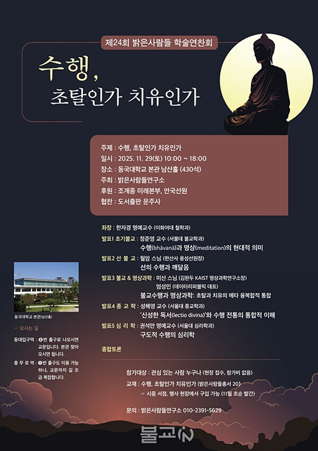 ºÒ±³¿Í »çȸÀÇ »ó»ýÀ» ¸ñÇ¥·Î Áö³ 20³â°£ ºÒ±³Àû ÁÖÁ¦¾î·Î ½É¸®ÇС¤Ã¶ÇС¤»çȸÇÐ µî ºÒ±³ÇÐ ¿Ü ÀÎÁ¢ Çй®°ú ¼ÒÅëÇØ ¿Â ¡®¹àÀº»ç¶÷µé¿¬±¸¼Ò¡¯(¼ÒÀå ¹ÚÂù¿í)´Â 11¿ù 11ÀÏ ¼¿ï Á¾·Î±¸ °¡È¸µ¿ ¾È±¹¼±¿ø¿¡¼ ±âÀÚ°£´ãȸ¸¦ ¿°í ¹àÀº »ç¶÷µé 20±Ç° ÃѼ ¡º¼öÇà, ÃÊÅ»Àΰ¡ Ä¡À¯Àΰ¡¡» Ãâ°£°ú ÇÔ²² ¡º¼öÇà, ÃÊÅ»Àΰ¡ Ä¡À¯Àΰ¡¡»¸¦ ÁÖÁ¦·Î ¡®Á¦24ȸ Çмú¿¬Âùȸ¡¯¸¦ ¿À´Â 11¿ù 29ÀÏ(Åä) ¿ÀÀü 10½ÃºÎÅÍ ¿ÀÈÄ 6½Ã±îÁö µ¿±¹´ëÇб³ º»°ü ³²»êȦ¿¡¼ °³ÃÖÇÑ´Ù°í ¹àÇû´Ù.