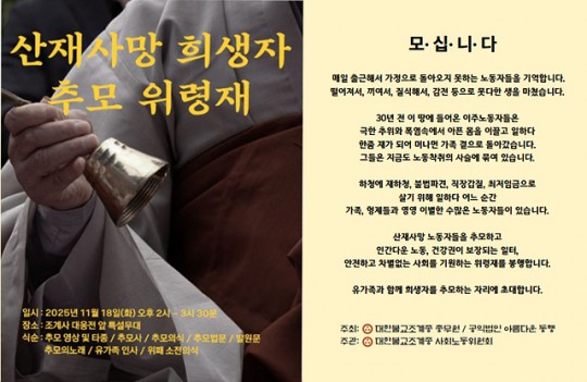 ´ëÇѺұ³Á¶°èÁ¾(Ãѹ«¿øÀå Áø¿ì ½º´Ô)Àº ºÒ±â 2569(2025)³â 11¿ù 18ÀÏ(È) ¿ÀÈÄ 2½Ã Á¶°è»ç ´ë¿õÀü ¾Õ¸¶´ç¿¡¼ ¸ðµç ³ëµ¿ÇöÀå »êÀç »ç¸Á ³ëµ¿ÀÚ, ÀÛ¾÷ Áß ºÎ»ó°ú °ú·Î·Î ÀÎÇÑ Áúȯ, Á÷Àå ³» ±«·ÓÈû µîÀ¸·Î ÀÎÇÑ »ç¸Á ³ëµ¿ÀÚ, ÃâÀÔ±¹´ç±¹ÀÇ ´Ü¼ÓÇöÀå¿¡¼ µ¹¾Æ°¡½Å ÀÌÁֳ뵿ÀÚµéÀÇ ±Ø¶ô¿Õ»ýÀ» ¹Ù¶ó´Â Ã߸ð À§·ÉÀ縦 ºÀÇàÇÑ´Ù.