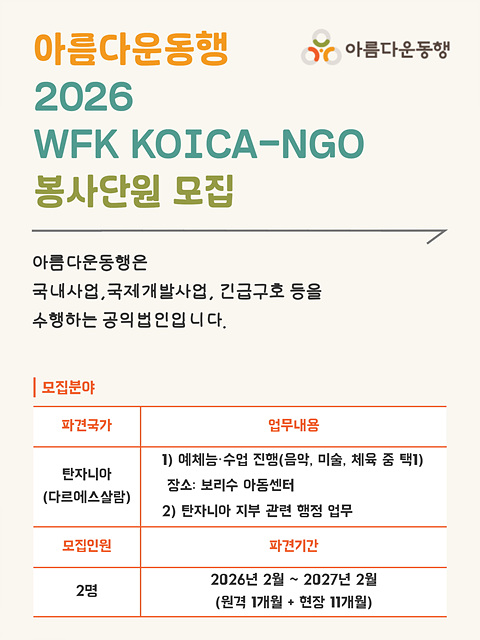 Àç´Ü¹ýÀÎ ¾Æ¸§´Ù¿îµ¿Çà(ÀÌ»çÀå Áø¿ì ½º´Ô, ´ëÇѺұ³Á¶°èÁ¾ Ãѹ«¿øÀå)Àº ±¹Á¦°³¹ßÇù·Â¹Î°£ÇùÀÇȸ(KCOC)¿Í Çù·ÂÇÏ¿©, ¾ÆÇÁ¸®Ä« źÀڴϾƷΠÇâÇÏ´Â ¡®2026 ¿ùµåÇÁ·»ÁîÄÚ¸®¾Æ(World Friends Korea) KOICA-NGOºÀ»ç´Ü¡¯ ´Ü¿øÀ» 2025³â 12¿ù 3ÀϱîÁö ¸ðÁýÇÑ´Ù.