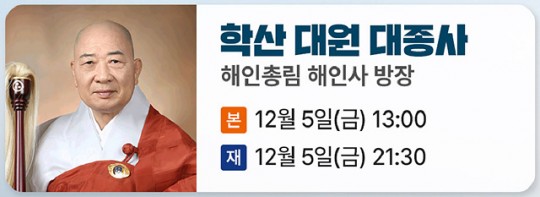 ÁߺÀ ¼ºÆÄ ´ëÁ¾»çÀÇ ¹ý¾î´Â °áÁ¦ÀÏÀÎ 12¿ù 4ÀÏ(¸ñ) ¹ã 11½Ã 10ºÐ¿¡, ÇØÀÎÃѸ² ÇØÀÎ»ç ¹æÀå ÇÐ»ê ´ë¿ø ´ëÁ¾»çÀÇ ¹ý¾î´Â 12¿ù 5ÀÏ(±Ý) ¿ÀÈÄ 1½Ã¿¡ ¹æ¼ÛÇÑ´Ù. Á¶°èÃѸ² ¼Û±¤»ç ¹æÀå Æí¾ç Çö¹¬ ´ëÁ¾»ç´Â 12¿ù 5ÀÏ(±Ý) ¿ÀÈÄ 1½Ã 30ºÐ¿¡, ¹ýÁÖ»ç Á¶½Ç ÇãÇã Áö¸í ´ëÁ¾»ç´Â 12¿ù 6ÀÏ(Åä) ¿ÀÀü 9½Ã 30ºÐ¿¡ ¹æ¼ÛÇÑ´Ù.