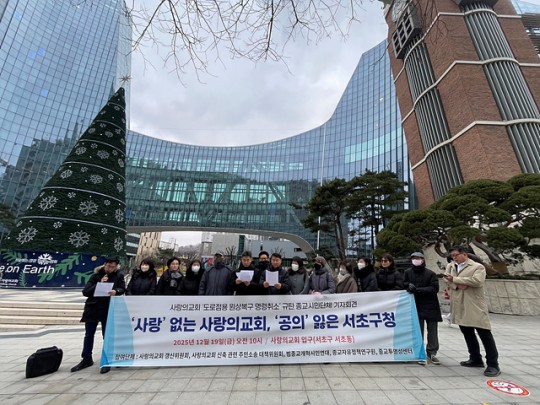 Á¾±³ÀÚÀ¯Á¤Ã¥¿¬±¸¿øÀº 2025³â 12¿ù 19ÀÏ(±Ý) ¿ÀÀü 10½Ã ¼Ãʵ¿ »ç¶ûÀDZ³È¸ ÀÔ±¸(ÁöÇÏö 2È£¼± ¼ÃÊ¿ª 3¹ø Ãⱸ)¿¡¼ ±âÀÚȸ°ßÀ» ¿°í, »ç¶ûÀDZ³È¸ µµ·ÎÁ¡¿ë Çã°¡ °ü·Ã Ç×¼Ò½É ÆÇ°á°ú °ü·ÃÇÏ¿© »ç¶ûÀDZ³È¸ °»½ÅÀ§¿øÈ¸ µî Á¾±³½Ã¹Î´ÜüµéÀÌ ¸ð¿© ºÒ¹ý ƯÇý ÆÇ°á°ú ¼Ãʱ¸Ã»ÀÇ Á÷¹«À¯±â¸¦ °·ÂÈ÷ ±ÔźÇÏ´Â ¼º¸í¼¸¦ ¹ßÇ¥Çß´Ù.