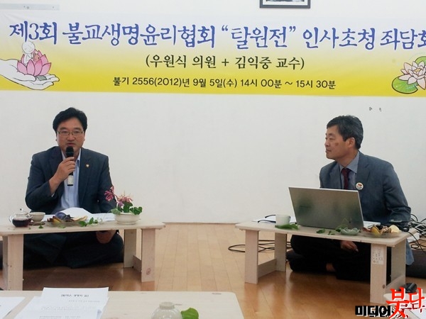ºÒ±³»ý¸íÀ±¸®Çùȸ°¡ ÁÖÃÖÇÑ Å»¿øÀü Àλç ÃÊû Á´ãȸ¿¡¼ µ¿±¹´ë ±èÀÍÁß ±³¼ö¿Í °í¸® 1È£±â À§Ç輺 ¹®Á¦¿¡ ´ëÇØ ´ëȸ¦ ³ª´©°í ÀÖ´Â ¹ÎÁÖÅëÇÕ´Ü ¿ì¿ø½Ä ±¹È¸ÀÇ¿ø.
