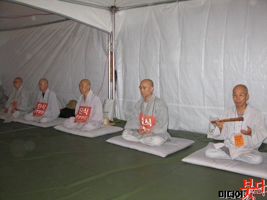 ¼öÁÂȸ´Â 9¿ù 6ÀÏ ¿ÀÈÄ 7½Ã Á¶°è»ç »çÀûºñ ¾Õ õ¸· Á¤Áø´Ü¿¡¼ ´Ü½ÄÀ» Æ÷ÇÔÇÑ ¿ë¸ÍÁ¤Áø¿¡ µé¾î°¬´Ù. ¿ë¸ÍÁ¤ÁøÀº ÇÏ·ç 24½Ã°£, Àڽ Ãѹ«¿øÀåÀÇ ¡®¾à¼Ó ÀÌÇ࡯ÀÌ ÀÌ·ïÁú ¶§±îÁö ¹«±âÇÑÀ¸·Î ÆîÃÄÁø´Ù.