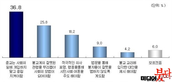 Å»¼¼, ºñÀÚ±Ý, °©À»°ü°è µî »çȸÀÇ À߸øµÈ °üÇà¿¡ ºÒ±³°è°¡ ÇØ¾ß ÇÒ °³ÀÔ È¤Àº ÇൿÀ» ¹¯´Â Áú¹®¿¡ ¡®Á¾±³´Â »çȸÀÇ ÀÏ¿¡ °³ÀÔÇÏÁö ¸»°í Á߸³À» ÁöÄÑ¾ß ÇÑ´Ù(36.8%)¡¯´Â ÀÀ´äÀÌ °¡Àå ¸¹¾Ò°í, ¡®ºÒ±³°èÀÇ À߸øµÈ °üÇàÀ» »Ñ¸® »Ì¾Æ »çȸÀÇ ¸ð¹üÀÌ µÇ¾î¾ß ÇÑ´Ù(25.8%)¡¯°¡ µÚ¸¦ À̾ú´Ù.
