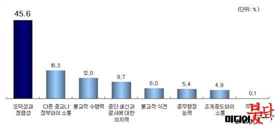 ÀÌ´Â ¡®´Ù¸¥ Á¾±³³ª Á¤ºÎ¿ÍÀÇ ¼ÒÅë(16.3%)¡¯À̳ª ¡®ºÒ±³Àû ¼öÇà·Â(12%)¡¯, ¡®Á¾´Ü ¼â½Å°ú °á»ç¿¡ ´ëÇÑ ÀÇÁö·Â(9.7%)¡¯, ¡®Á¾¹«ÇàÁ¤´É·Â(5.4%)¡¯ µî¿¡ ¿ùµîÇÏ°Ô ¾Õ¼± °á°úÀÌ´Ù.