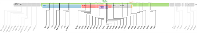 ¿À¹ÌÅ©·Ð º¯ÀÌÀÇ À¯Àüü. 50°³ÀÇ µ¹¿¬º¯À̰¡ ÀϾ´Âµ¥, ÀÌ Áß 32°³°¡ ½ºÆÄÀÌÅ© ´Ü¹éÁú¿¡¼ ¹ß°ßµÆ´Ù. (Ãâó: Stanford University CORONAVIRUS ANTIVIRAL & RESISTANCE DATABASE)