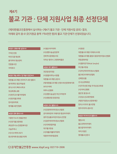 (Àç)´ëÇѺұ³ÁøÈï¿ø(ÀÌ»çÀå : ÀÌÇѱ¸)Àº ºÒ±³ÀÇ Çö´ëÈ ¡¤ »ýÈ°È ¡¤ ´ëÁßȶó´Â Àç´ÜÀÇ ¼³¸³ ÃëÁö¸¦ »õ·Ó°Ô Á¶¸íÇϰí, ½Ã´ë »óȲ¿¡ ¸Â´Â ºÒ±³ ÁøÈïÀ» À§ÇØ 2022³â ÇϹݱ⿡ 4´ë °ø¸ð»ç¾÷À» ½Ç½ÃÇÑ´Ù.