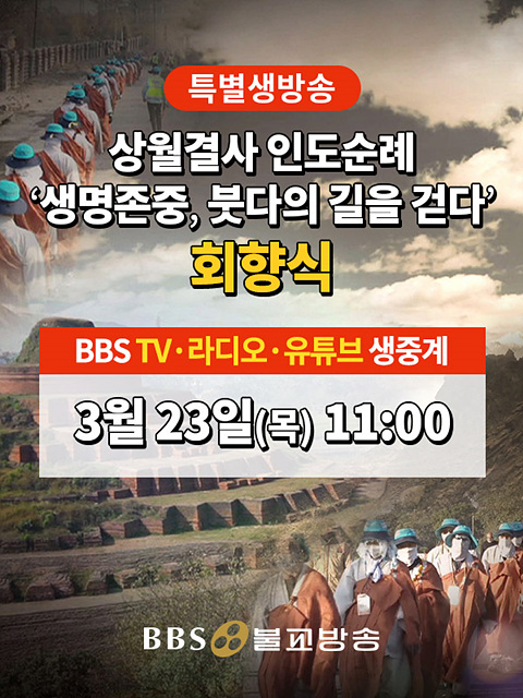 BBS ºÒ±³¹æ¼Û(»çÀå À̼±Àç)Àº »ó¿ù°á»ç Àεµ¼ø·Ê ¡®»ý¸íÁ¸Áß, º×´ÙÀÇ ±æÀ» °È´Ù¡¯ Á¶°è»ç¿¡¼ ºÀÇàµÇ´Â ȸÇâ½ÄÀ» 3¿ù 23ÀÏ(¸ñ)¿ÀÀü 11½ÃºÎÅÍ BBS TV¿Í ¶óµð¿À, À¯Æ©ºê·Î »ýÁß°èÇÑ´Ù.