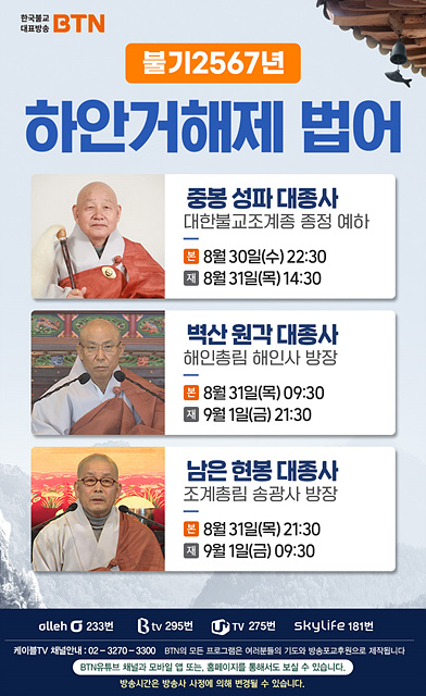 BTNºÒ±³TV(´ëÇ¥ÀÌ»ç ±¸º»ÀÏ)´Â Àü±¹ÀÇ ¼±¿ø¿¡¼ ºÀÇàÇÏ´Â ºÒ±â2567(2023)³â ÇϾȰÅÇØÁ¦¸¦ ¸Â¾Æ 8¿ù 30ÀϺÎÅÍ 9¿ù 1ÀϱîÁö ´ëÇѺұ³Á¶°èÁ¾ Á¾Á¤ ¿¹ÇÏ ÁߺÀ ¼ºÆÄ ´ëÁ¾»ç¿Í »ïº¸Á¾Âû ¹æÀ彺´ÔµéÀÇ ÇÏ¾È°Å ÇØÁ¦¹ý¾î ƯÁýÇÁ·Î±×·¥À» ¹æ¼ÛÇÑ´Ù.