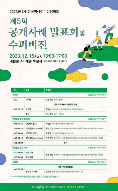 »ç´Ü¹ýÀÎ Çѱ¹¸í»ó½É¸®»ó´ãÇÐȸ(ȸÀå ¼Õ°¼÷, Á߾ӽ°¡´ë ±³¼ö)´Â ºÒ±â2567(2023)³â 12¿ù 15ÀÏ ¿ÀÈÄ 1½ÃºÎÅÍ ¿ÀÈÄ 5½Ã±îÁö ´ëÇѺұ³Á¶°èÁ¾ º¸¹®»ç(°æ±â Æ÷õ±º À̵¿¸é µµÆò¸® 71)¿¡¼ ¡°Á¦5ȸ °ø°³»ç·Ê ¹ßǥȸ ¹× ¼öÆÛºñÀü¡± Çà»ç¸¦ °³ÃÖÇÑ´Ù.