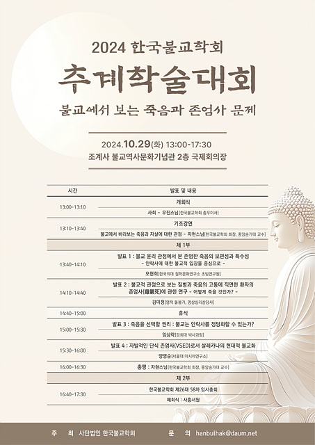 ⟪ºÒ±³¿¡¼ º¸´Â Á×À½°ú Á¸¾ö»ç ¹®Á¦⟫¸¦ ´ëÁÖÁ¦·Î ÁøÇàµÇ´Â À̹ø Çмú´ëȸ´Â ¡ã<ºÒ±³¿¡¼ ¹Ù¶óº¸´Â Á×À½°ú Àڻ쿡 ´ëÇÑ °üÁ¡>¿¡ ´ëÇÑ Á߾ӽ°¡´ë ±³¼ö ÀÚÇö ½º´ÔÀÇ ±âÁ¶°¿¬À» ½ÃÀÛÀ¸·Î ¡ã<ºÒ±³ À±¸® °üÁ¡¿¡¼ º» Á¸¾öÇÑ Á×À½ÀÇ º¸Æí¼º°ú Ư¼ö¼º: -¾È¶ô»ç¿¡ ´ëÇÑ ºÒ±³Àû ÀÔÀåÀ» Áß½ÉÀ¸·Î-> / ¹ßÇ¥: ¿ÀÇöÈñ(Çѱ¹¿Ü´ë öÇй®È¿¬±¸¼Ò Ãʺù¿¬±¸¿ø) ¡ã<ºÒ±³Àû °üÁ¡À¸·Î º¸´Â Áúº´°ú Á×À½ÀÇ °íÅë¿¡ Á÷¸éÇÑ È¯ÀÚÀÇ Á¸¾ö»ç(ðîåñÞÝ)¿¡ °üÇÑ ¿¬±¸: - ¾î¶»°Ô Á×À» °ÍÀΰ¡?>/ ¹ßÇ¥: ±è¹ÌÁ¤(¿µÀû µ¹º½°¡, ¸í»ó½É¸®»ó´ã»ç) ¡ã<Á×À½À» ¼±ÅÃÇÒ ±Ç¸®: ºÒ±³´Â ¾È¶ô»ç¸¦ Á¤´çÈÇÒ ¼ö Àִ°¡?> / ¹ßÇ¥: ÀÏÀ±½º´Ô¡¸ÀÓ»ó¶ô¡¹(°æÈñ´ëÇб³ öÇаú ¹Ú»ç°úÁ¤) ¡ã<ÀÚ¹ßÀûÀÎ ´Ü½ÄÁ¸¾ö»ç(VSED)·Î¼ »ì·¹Ä«³ªÀÇ Çö´ëÀû ºÒ±³È> / ¹ßÇ¥: ¾ç¿µ¼ø(¼¿ï´ë ¾Æ½Ã¾Æ¿¬±¸¼Ò ¼±ÀÓ¿¬±¸¿ø)°¡ °¢°¢ ¹ßÇ¥µÈ´Ù.