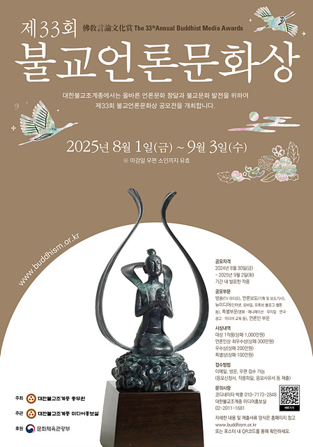 ´ëÇѺұ³Á¶°èÁ¾ Ãѹ«¿ø(Ãѹ«¿øÀå Áø¿ì ½º´Ô)Àº ±¹¹ÎÅëÇÕ°ú »çȸ¹ßÀü¿¡ ±â¿©ÇÏ°í ºÒ±³ÀÇ Âü¸ð½ÀÀ» ³Î¸® ¾Ë¸®´Â µ¥ À̹ÙÁöÇÑ ¹æ¼Û, ¾ð·Ðº¸µµ, ´º¹Ìµð¾î ºÐ¾ßÀÇ ÀÛǰÀ» ¼±Á¤ÇÏ¿© ¡®Á¦33ȸ ºÒ±³¾ð·Ð¹®È»ó¡¯À» ½Ã»óÇÑ´Ù.