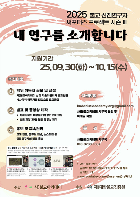 ¸Å³â ¹èÃâµÇ´Â ºÒ±³ °ü·Ã ¹Ú»çÇÐÀ§ÀÚµéÀÇ ¿¬±¸ ¼º°ú¸¦ Àß ¾Ë¸®°íÀÚ 2023³â ½ÃÀÛµÈ ºÒ±³ °ü·Ã ½ÅÁø¿¬±¸ÀÚ ½áÆ÷ÅÍÁî ÇÁ·ÎÁ§Æ®-¡°³» ¿¬±¸¸¦ ¼Ò°³ÇÕ´Ï´Ù¡±°¡ ¾î´Àµ¡ 3³âÂ÷¸¦ ¸ÂÀÌÇß´Ù. ¸ÅÇØ ¾ö°ÝÇÏ°Ô ¼±Á¤µÈ 3ÀÎÀÇ ¿¬±¸°¡ À¯Æ©ºê »ç)ºÒ±³¾ÆÄ«µ¥¹ÌTV¿¡ ¾÷·Îµå µÇ¾úÀ¸¸ç 2õ ȸ ÀÌ»óÀÇ Á¶È¸¼ö µî ¸¹Àº ºÒÀÚ ´ëÁßÀÇ °ü½ÉÀ» ²ø¾î³Â´Ù.