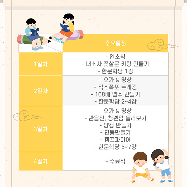 ¡®[3¹Ú4ÀÏ]³»¼Ò»ç Çѹ®Çд硯ÀÇ ÁÖ¿äÀÏÁ¤Àº ÇÑÀÚ°ÀÇ 1°~7°, ¿ä°¡&¸í»ó, 108¹è ¿°ÁÖ ¸¸µé±â, Á÷¼ÒÆøÆ÷ Æ®·¹Å·, Ä·ÇÁÆÄÀ̾î, ¿¬µî¸¸µé±â, ۸µ¸¸µé±â µîÀÌ ÁøÇàµÉ ¿¹Á¤ÀÌ´Ù.