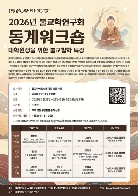 ºÒ±â 2570(2026)³â 2¿ù 23ÀÏ(¿ù)ºÎÅÍ 25ÀÏ(¼ö. °¿¬), 2¿ù 26ÀÏ(¸ñ. ¹ßǥȸ)¿¡ ¼¿ï´ëÇб³ 14µ¿ 213È£¿¡¼ ÁøÇàÇÏ´Â À̹ø ¿öÅ©¼¥Àº Àεµ¡¤Ãʱâ Áß±¹¡¤´ç¼Û´ë ºÒ±³Ã¶ÇÐ Àü¹®°¡µé ¼¼ ºÐÀÌ °¢ÀÚ ¼¼ °¡ÁöÀÇ ¿¬±¸ÁÖÁ¦·Î 3ÀÏ µ¿¾È °¿¬À» ÁøÇàÇÏ¿© ºÒ±³»ç»ó»ç¸¦ ¾ÐÃàÀûÀ̰í ü°èÀûÀ¸·Î Á¶¸ÁÇÒ ¼ö ÀÖµµ·Ï ±âȹµÆ´Ù. ¿öÅ©¼¥Àº ºÒ±³Ã¶ÇÐ Àü°ø ¿©ºÎ¿Í »ó°ü¾øÀÌ ºÒ±³ °ü·Ã ºÐ¾ß Àü°øÀÚ¶ó¸é ´©±¸³ª µéÀ» ¼ö ÀÖ´Â ¼öÁØÀ¸·Î °¿¬ÀÌ ÁøÇàµÈ´Ù.