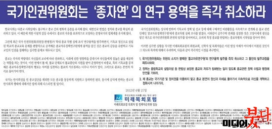 ¹Ì·¡¸ñȸÆ÷·³ÀÌ 7¿ù 3ÀÏ Á¶¼±ÀϺ¸¿¡ "±¹°¡ÀαÇÀ§¿øÈ¸´Â 'Á¾ÀÚ¿¬'ÀÇ ¿¬±¸¿ë¿ªÀ» Áï°¢ Ãë¼ÒÇ϶ó"¸ç ±¤°í¸¦ °ÔÀçÇØ ¹°ÀǸ¦ ÀÏÀ¸Å°°í ÀÖ´Ù. (»çÁøÄ¸ÃÄ=¹Ì·¡¸ñȸÆ÷·³ ȨÆäÀÌÁö)