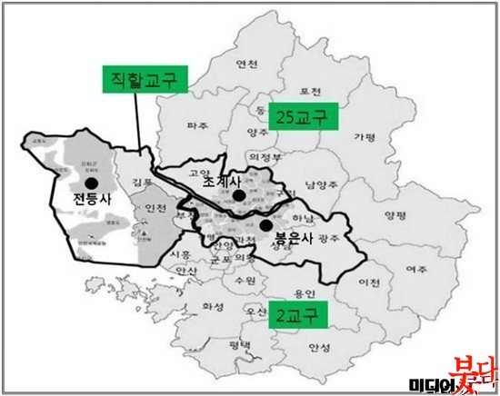 Á÷ÇÒ±³±¸´Â ¼¿ïÀ» ºñ·ÔÇØ °í¾ç, ±¤ÁÖ, ÀÎõ, °È, ±èÆ÷, ¼º³², ±¤¸í, Çϳ², ±¸¸® µîÀ» °üÇÒÇÑ´Ù. 2±³±¸ ¿ëÁÖ»ç´Â ¼ö¿ø, ȼº, ¾È¼º, ¿ëÀÎ, ÆòÅÃ, ½ÃÈï, ±ºÆ÷, ÀÇ¿Õ µîÀ» ¸Ã´Â´Ù. 25±³±¸ ºÀ¼±»ç´Â ÀÇÁ¤ºÎ, ¾çÁÖ, ³²¾çÁÖ, ÆÄÁÖ, Æ÷õ, µ¿µÎõ µîÀ» °üÀåÇÑ´Ù.