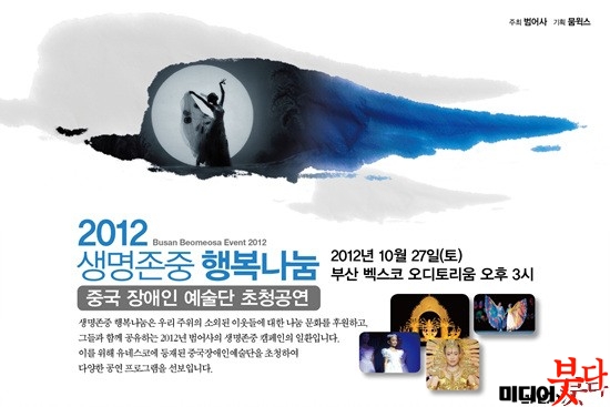 ¿À´Â 10¿ù 27ÀÏ ºÎ»ê º¤½ºÄÚ ¿ÀµðÅ丮¿ò¿¡¼ ÆîÃÄÁú õ¼öõ¾È°üÀ½¹« °ø¿¬Àº õ¼ö°ü¼¼À½º¸»ìÀÇ ´ëÀÚ´ëºñ¸¦ ±â¸®¸ç Àΰ£ÀÇ °í(ÍÈ)¿¡ ´ëÇÑ ¼ºÂûÀ» ¹«¿ëÀ¸·Î ½ÂȽÃŲ °ÍÀÌ´Ù. 2008³â º£ÀÌ¡ Àå¾ÖÀÎ ¿Ã¸²ÇÈÀ» ÅëÇØ ¼¼°èÀÇ À̸ñÀ» ²ö Áß±¹ Àå¾ÖÀο¹¼ú´ÜÀº À̳¯ ÄܼƮ¿¡¼ õ¼öõ¾È°üÀ½¹«¸¦ ºñ·ÔÇØ À½¾Ç, ¿¬±Ø, ¿ÀÆä¶ó µî 5°³ °ø¿¬À» ¼±º¸ÀδÙ.