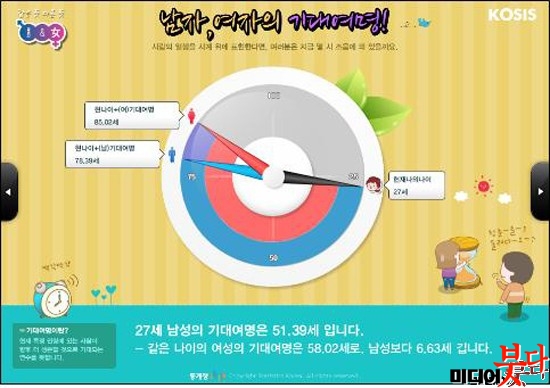Åë°èûÀº ù Á¶»ç·Î ³²ÀÚ, ¿©ÀÚÀÇ ±â´ë¿©¸í(ÀÌ¿ëÀÚ°¡ ÀÔ·ÂÇÑ ¼ºº°°ú ¸¸³ªÀÌ·Î ³²³à ±â´ë¿©¸í ºñ±³), ³²ÀÚ, ¿©ÀÚÀÇ ¿¬·É´ëº° »ýȰ½Ã°£ Ȱ¿ë µî¿¡ ´ëÇÑ °£·«ÇÑ Åë°è µîÀ» Á¦½ÃÇØ Èï¹Ì·Î¿î °á°ú¸¦ Á¦°øÇϰí ÀÖ´Ù.