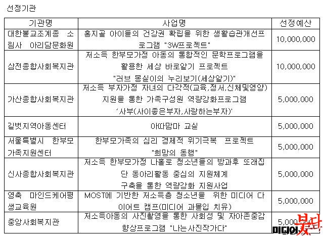 À̹ø °ø¸ð»ç¾÷Àº Àú¼Òµæ°¡Á¤ÀÇ º¹Áö ÁõÁø ¹× »îÀÇ Áú Çâ»óÀ» À§ÇÑ Ã¢ÀÇÀûÀ̰í Àü¹®ÀûÀÎ »ç¾÷À» °ø¸ðÇÏ´Â °ÍÀ¸·Î ¾Æµ¿¡¤Ã»¼Ò³âµé¿¡ ´ëÇÑ »çȸ¹®È üÇèȰµ¿ ¹× ±³À°È°µ¿ »ç¾÷À» Áß½ÉÀ¸·Î ÁøÇàµÆÀ¸¸ç 2012³â 11¿ù 6ÀÏ °ø¸ð¸¦ ½ÃÀÛÀ¸·Î 12¿ù 14ÀϱîÁö ÃÑ 56°³ÀÇ ´Üü°¡ ÀÀ¸ðÇß´Ù.