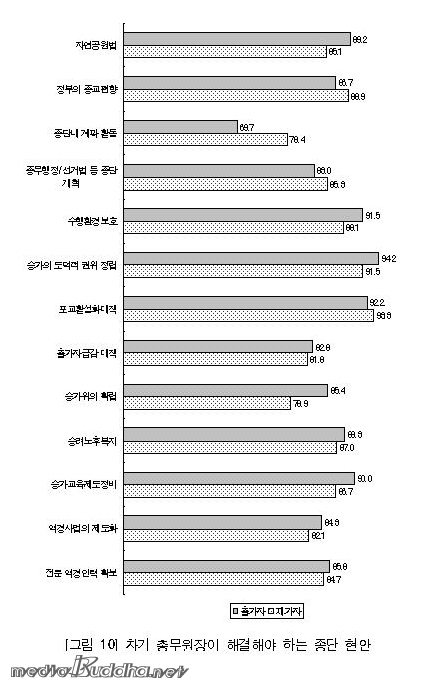 Çö¾Èº° ÀÀ´äÀÚ Æò±ÕÀ» »ìÆìº» °á°ú Æ÷±³È°¼ºÈ ´ëÃ¥ÀÌ 9.296Á¡, ½Â°¡ÀÇ ´ë»çȸÀû µµ´öÀû ±ÇÀ§ È®¸³ 9.241Á¡À¸·Î ¸Å¿ì Áß¿äÇÑ °úÁ¦·Î ¼±Á¤µÇ¾ú´Ù. ´ÙÀ½À¸·Î´Â ¼öÇàȯ°æ º¸È£ 8.929Á¡, Á¤ºÎÀÇ Á¾±³ÆíÇâ 8.825Á¡, ½Â°¡±³À°Á¦µµ Á¤ºñ 8.783Á¡, ½Â·Á ³ëÈĺ¹Áö ÇØ°á 8.756Á¡, ÀÚ¿¬°ø¿ø¹ý Á¤ºñ 8.660Á¡, Àü¹® ¿ª°æÀη Ȯº¸ 8.510Á¡, Á¾¹«ÇàÁ¤ ¹× ¼±°Å¹ý µî Á¾´Ü°³Çõ 8.459Á¡, ¿ª°æ»ç¾÷ÀÇ Á¦µµÈ 8.292Á¡, Ãâ°¡ÀÚ ±Þ°¨¿¡ ´ëÇÑ ´ëÃ¥ 8.217Á¡, ½Â°¡ À§ÀÇ È®¸³ ´ëÃ¥ 8.126Á¡, Á¾´Ü ³» °èÆÄ Ȱµ¿ 7.596Á¡ µîÀÇ ¼ø¼·Î ³ªÅ¸³µ´Ù.