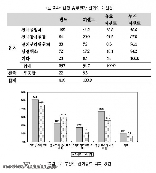 ÇöÇà Ãѹ«¿øÀå ¼±°ÅÁ¦µµ¿¡ ´ëÇÏ¿© ÀüüÀûÀ¸·Î ¾à 2/3 ÀÌ»óÀÌ ºÎÁ¤ÀûÀÎ ½Ã°¢À» °®°í ÀÖ´Â °ÍÀ¸·Î Á¶»çµÇ¾ú´Ù. ÀÌ¿¡ ´ëÇØ¼ ±àÁ¤ÀûÀ¸·Î Æò°¡ÇÏ´Â ½Ã°¢Àº ¾à 10% Á¤µµ¿¡ ºÒ°úÇÏ¿© Ãѹ«¿øÀå ¼±°ÅÁ¦µµÀÇ °³¼±ÀÌ ÇÊ¿äÇÏ´Ù´Â Á¾´Ü³»¿ÜÀÇ °ø°¨´ë°¡ Çü¼ºµÇ°í ÀÖÀ½À» ¾Ë ¼ö ÀÖ´Ù.