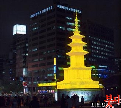 ¿ÃÇØ ¼¿ï½Ãû ¾Õ ±¤Àå¿¡ ¹àÇôÁö´Â ¡®¼®°¡Å¾Ôó¡¯Àº ±¹º¸ Á¦21È£ÀÎ ºÒ±¹»ç»ïÃþ¼®Å¾(¼®°¡Å¾)À» ¿øÇüÀ¸·Î »ï¾Æ Á¦ÀÛÇÑ °ÍÀÌ´Ù. ¡®¼®°¡Å¾µî;Àº ÀüÅë ÇÑÁö·Î Á¦À۵ǾúÀ¸¸ç ¡®1:1.618¡¯ÀÇ È²±ÝºñÀ²·Î Á¦ÀÛµÈ ¼®°¡Å¾ÀÇ ¡®¿Ïº®ÇÑ ¾Æ¸§´Ù¿ò¡¯À» ÀçÇöÇÑ ³ôÀÌ 18m(Á´ë 2.7m Æ÷ÇÔ)¿¡ À̸£´Â »ó¡¹°ÀÌ´Ù.